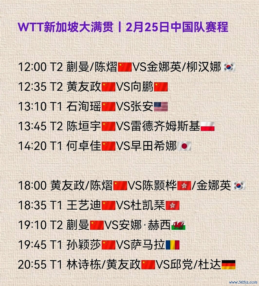 WTT新加坡大满贯(2026)热战正浓,北京时间2月25日进入正赛第四天。根据赛程安排,今天将决出男女单打16强以及三项双打4强。